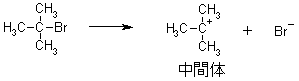 | ハロゲン原子の脱離 | 炭素陽イオンと求核体の結合 | ||||||||